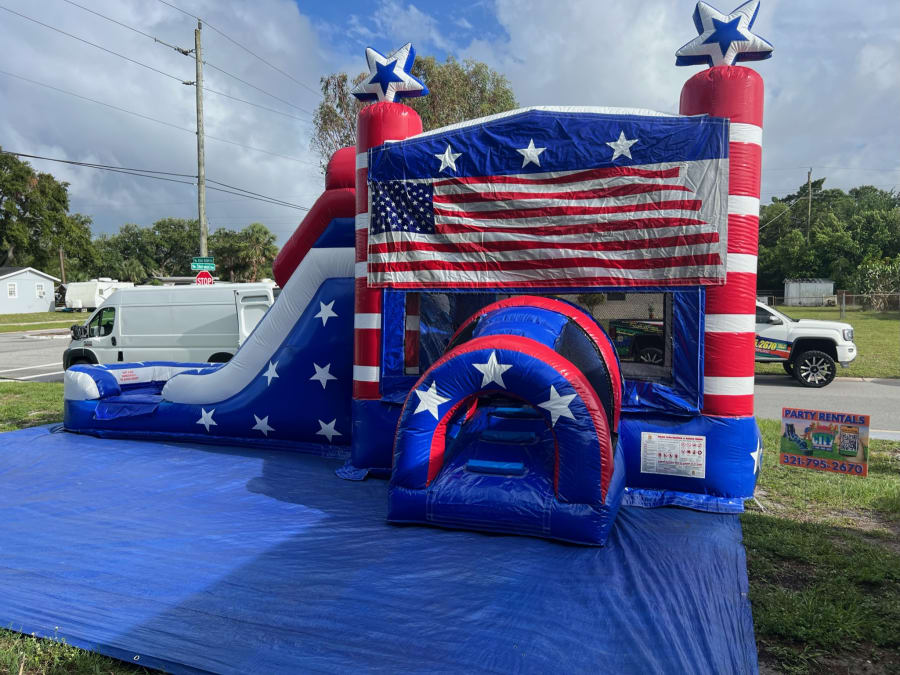 Looking for the best bounce house water slide combo in Palm Bay or Brevard County? The All American Combo brings red, white, and WOW to your event with stars, stripes, and endless fun. This patriotic inflatable is perfect for summer birthdays, school field days, church events, or 4th of July block parties!