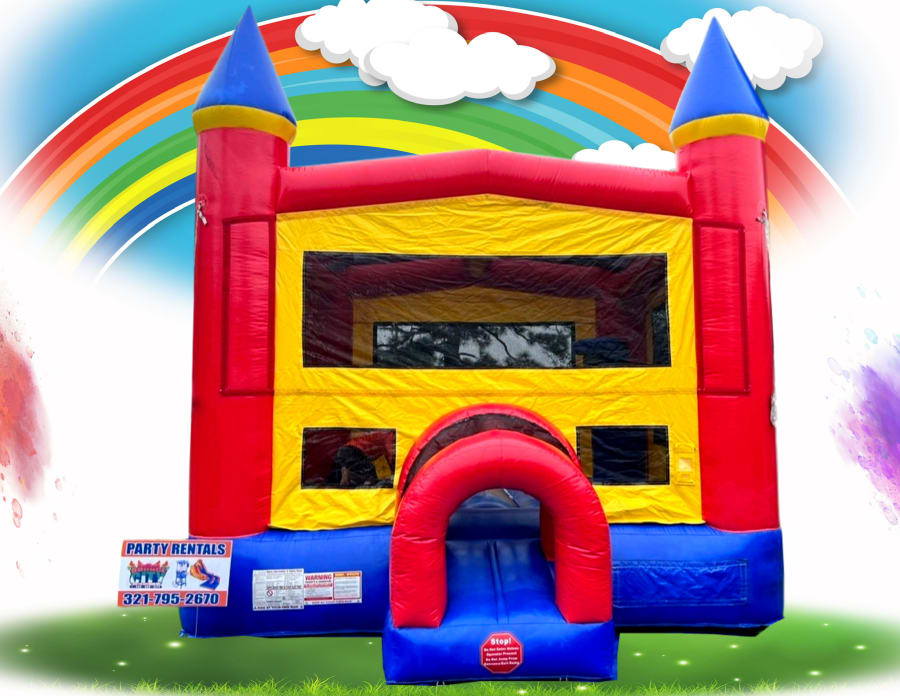 Add a burst of color to your next event with the Rainbow Bounce House — a classic, fun-filled inflatable perfect for kids’ birthday parties, school events, and community gatherings across Palm Bay and Brevard County. Its bright red, yellow, and blue design paired with castle-style turrets makes it a hit for both boys and girls!