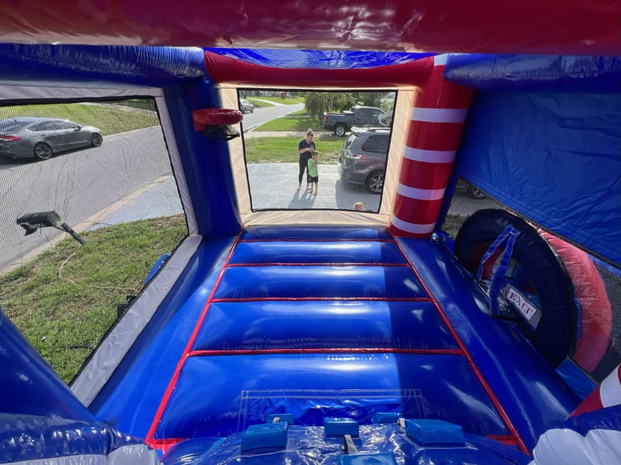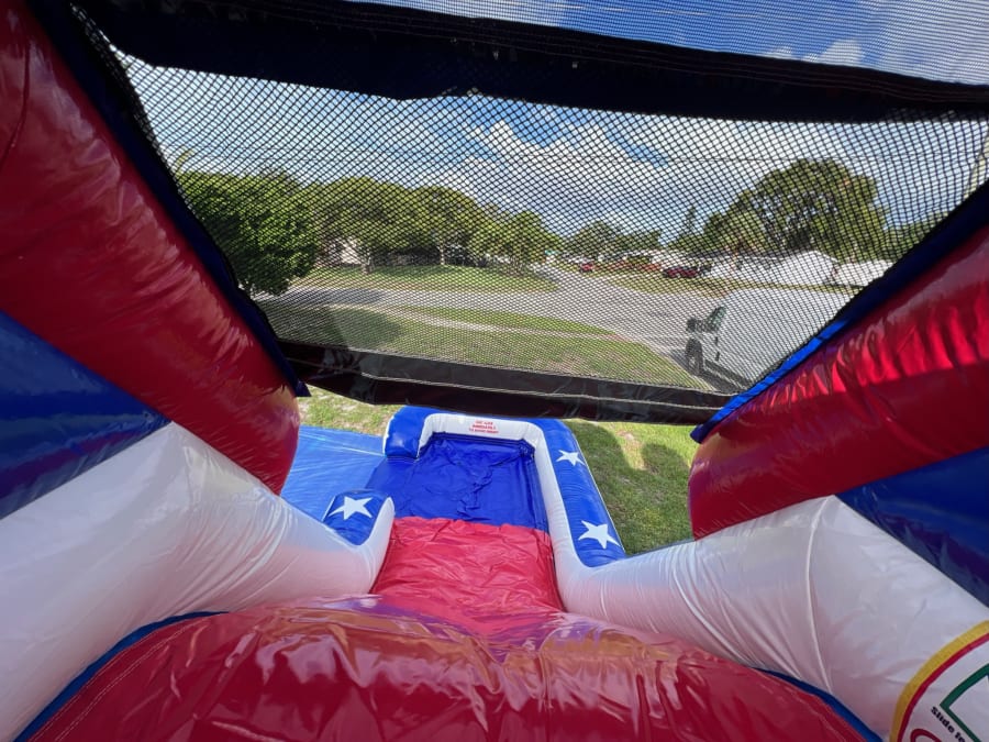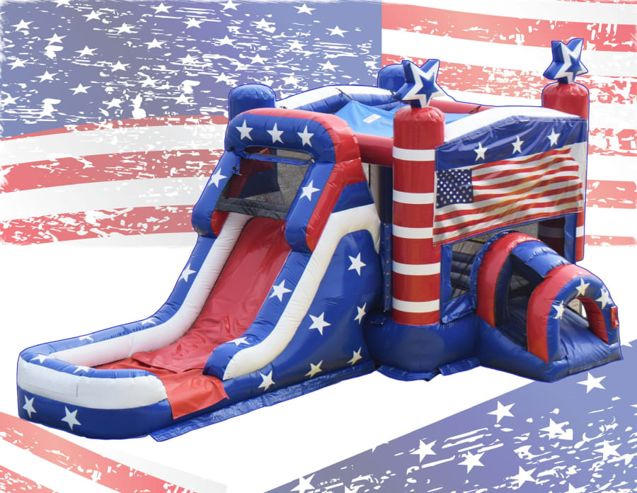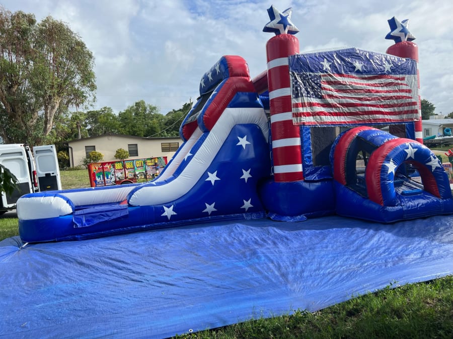 Looking for the best bounce house water slide combo in Palm Bay or Brevard County? The All American Combo brings red, white, and WOW to your event with stars, stripes, and endless fun. This patriotic inflatable is perfect for summer birthdays, school field days, church events, or 4th of July block parties!