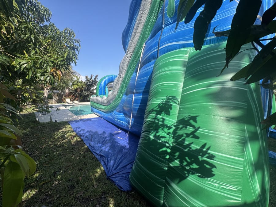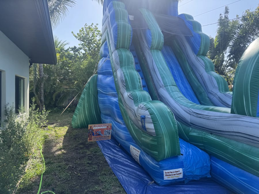 Turn up the heat with the Super Drip 27ft inflatable water slide, one of the tallest and most exciting slides available in Brevard County. This vibrant green-and-blue giant waterslide brings ultimate summer party vibes to any event and gives you three rental options for the way YOU want to slide!