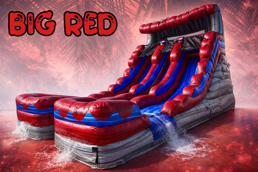 Big Red is a show-stopping 18 ft tall double lane water slide built for fast thrills and family fun. Use it wet for splashy races or dry for all-season excitement. Includes a heavy-duty tarp for safe landings and easy setup. Perfect for backyard parties, neighborhood events, and school functions across brevard county.